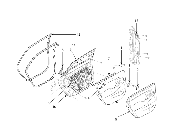 9. Rear door module assembly 10. Rear door panel 11. Rear door body side weatherstrip 12. Rear door side weatherstrip 13. Rear door hinge |