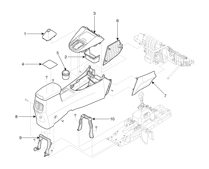 7. Console extension cover [RH] 8. Floor console assembly 9. Console rear mounting bracket 10. Console front mounting bracket |