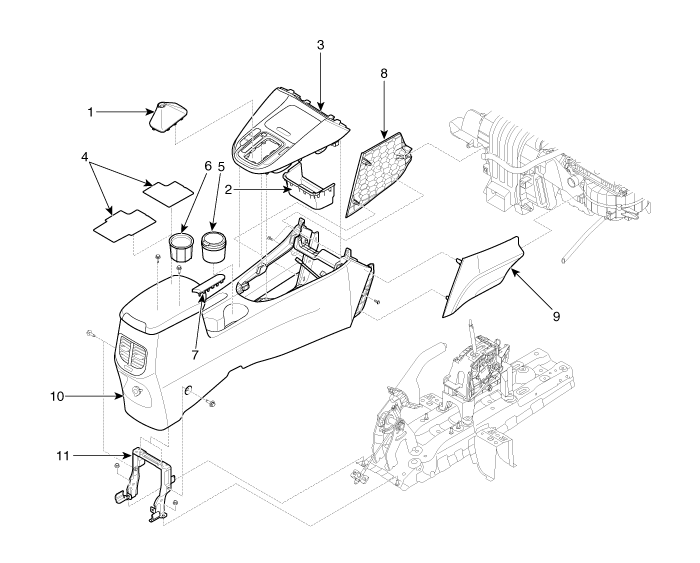 7. Parking brake cover 8. Console extension cover [LH] 9. Console extension cover [RH] 10. Floor console assembly 11. Console rear mounting bracket |