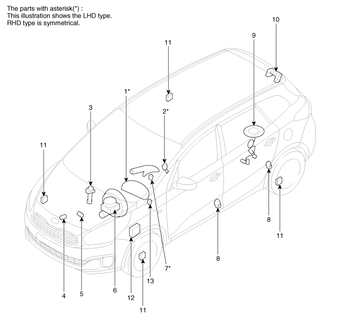 8. Door switch 9. Fuel gauge sender 10. Tailgate switch 11. Wheel speed sensor 12. ABS ECU 13. Active ECO switch |