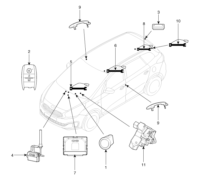 7. Smart key unit 8. Trunk antenna 9. Door handle & door antenna 10. Bumper antenna 11. Electronic steering column lock (ESCL) |