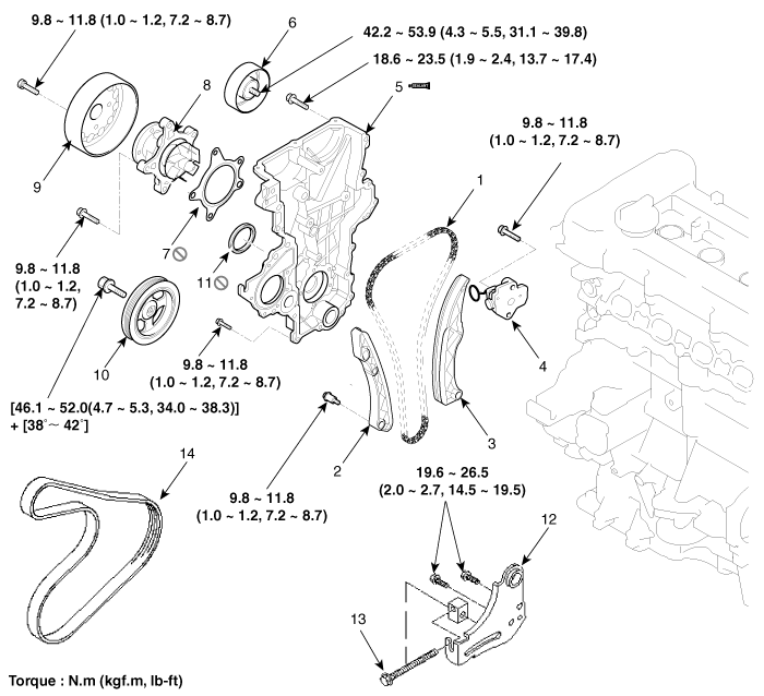 Timing chain 2. Timing chain guide 3. Timing chain arm 4. Timing chain auto tensioner 5. Timing chain cover 6. Drive belt idler 7. Water pump gasket |