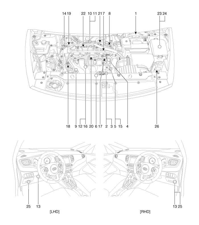 15. ETC Motor [integrated into ETC Module] 16. Injector 17. Purge Control Solenoid Valve (PCSV) 18. CVVT Oil Control Valve (OCV) [Bank 1 / Intake] 19. CVVT Oil Control Valve (OCV) [Bank 1 / Exhaust] 20. Variable Intake Solenoid (VIS) Valve 21. Fuel Pressure Control Valve (FPCV) 22. Ignition Coil 23. Main Relay 24. Fuel Pump Relay 25. Data Link Connector (DLC) [16-Pin] 26. Multi-Purpose Check Connector [20-Pin] |