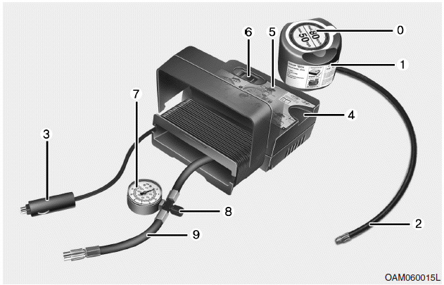 Kia Carens: If you have a flat tire (with tire mobility kit) / Components of the Tire Mobility Kit (TMK)
