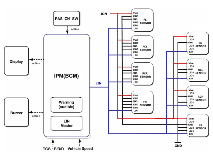 PAS consists of 8 sensors(Front 4 EA, Rear 4EA) which are detecting the obstacles