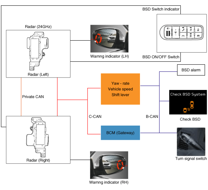 Blind Spot Detection (BSD) System : Detects other vehicles in the rear