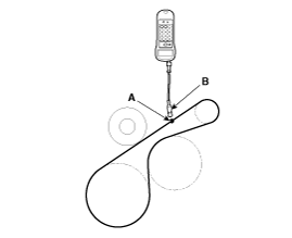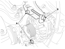 Adjust tension by tightening the alternator tension adjust bolt (B)