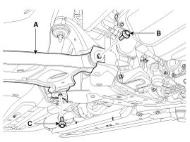 Loosen the bolts and nuts and then remove the front lower arm (A).
