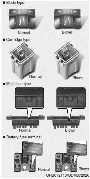 Three kinds of fuses are used: blade type for lower amperage rating, cartridge type, and multi fuse type for higher amperage ratings.