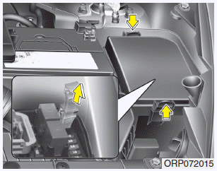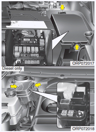 After checking the fuse box in the engine compartment, securely install the fuse box cover. If not, electrical failures may occur from water leaking in.