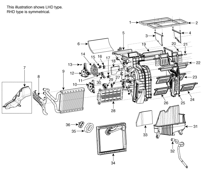 25. Dual Heater Separator 26. Dual RH Temp Door Assembly 27. Temperature Door Single Arm 28. PTC Heater 29. Temperature Door Lever 30. Floor Door Lever 31. Lower Case 32. Drain Hose 33. Antinoise Pad 34. Evaporator Core Assembly 35. Evaporator Pipe Seal 36. Joint Flange Cap |