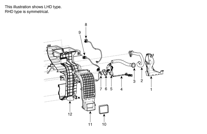1. Flange Seal 2. Flange Seal 3. Ventilation Guide 4. Ventilation Guide 5. Heater Case 6. Antinoise Pad 7. Foot Shower Left Duct 8. Heater Core Cover 9. Heater Core & Seal Assembly 10. Temp Actuator Motor Assembly 11. Spring Washer 12. Mode Actuator Assembly |