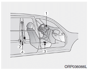 The seat belt pre-tensioner system consists mainly of the following components. Their locations are shown in the illustration: