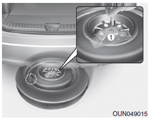 2. Place the wheel under the vehicle and install the retainer (1) through the wheel center.