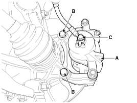 Loosen the hose eyebolt (C) and caliper mounting bolts (B), then remove