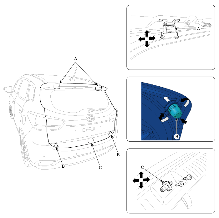 After loosening the tail gate striker (C) mounting bolts, adjust the
