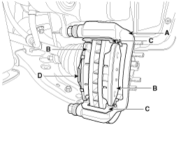 Remove the pad shim (D), pad retainers (C) and brake pads (B) in the