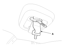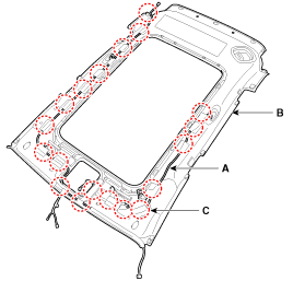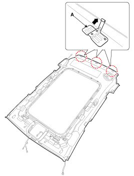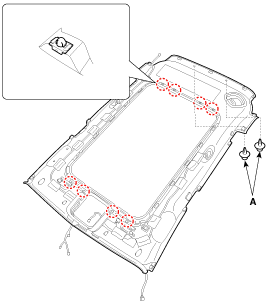 Using a clip remover, detach the roof trim assembly mounting clips (A).