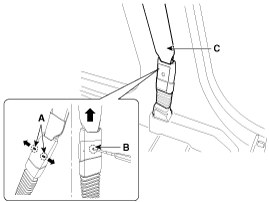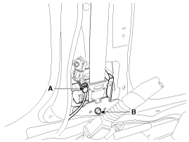 Loosen the seat belt pretensioner mounting bolts (B) and remove the