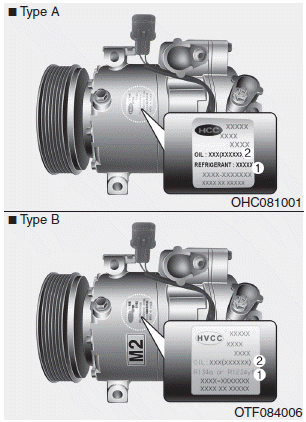 A compressor label informs you the type of compressor your vehicle is equipped with such as model, supplier part number, production number, refrigerant (1) and refrigerant oil (2).