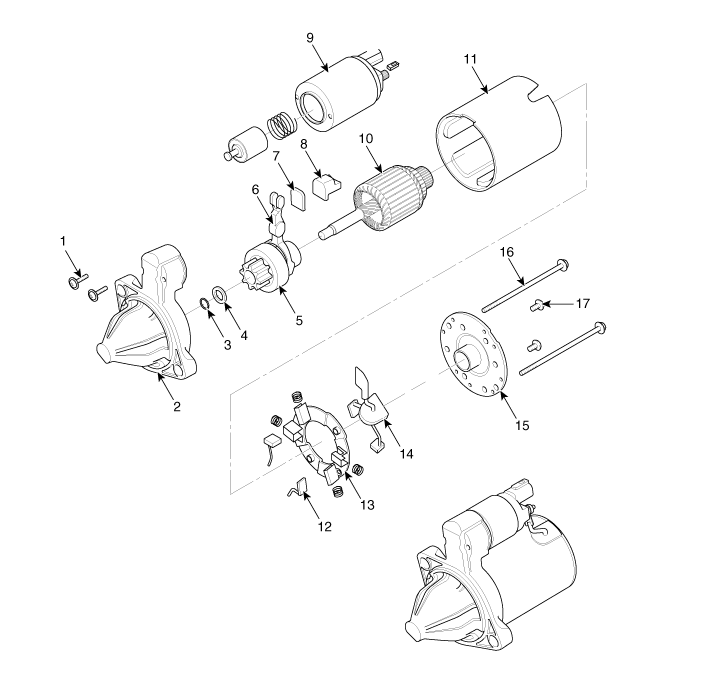 assembly 11. Yoke assembly 12. Brush (-) 13. Brush holder 14. Brush (+) 15. Rear bracket 16. Through bolt 17. Screw |