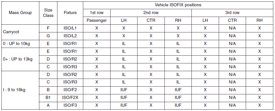 Kia Carens: Using a child restraint system / Suitability of each seating position for ISOFIX child restraint systems according
