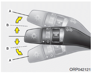 turn signals, move the lever up or down (A). Green arrow indicators on the instrument