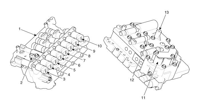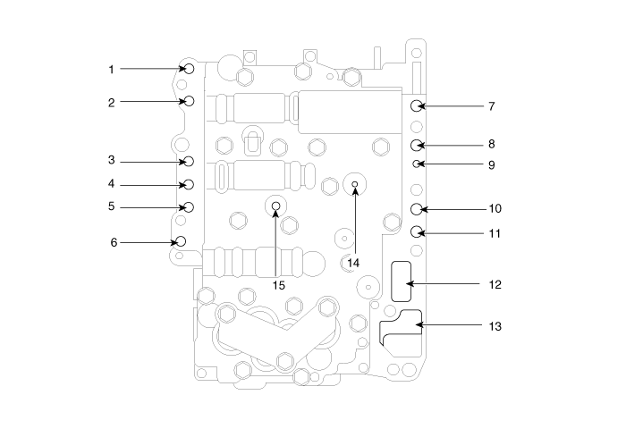 Brake Control Solenoid Valve(26/B) 9. 35R Clutch Control Solenoid Valve(35R/C) 10. Torque Converter Control Solenoid Valve (T/CON) 11. Accumulator 12. Low & reverse brake(LR/B)pressure flow hole 13. Under drive brake(UD/B)pressure flow hole |